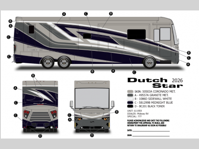 Are you looking to upgrade your motorhome to a more luxurious unit? Look no further than this Dutch Star Class A diesel motorhome. You will love the space provided by the full-wall slide and two additional slides, plus the rear bath cathedral ceiling will add extra height. Take a rest on the pillowtop king bed or relax on the hide-a-bed sofa. There is a passenger workstation and a hide-a-leaf dinette if you're needing to get some work done while on vacation, and the power awning outside will provide shade if you're wanting to work in fresh air. Don't worry about stopping for food because this model includes a Whirlpool 19.7-cu. ft. refrigerator that will allow you to stock up for the week, and you can cook with the all-electric induction cooktop or stainless steel convection microwave with an air fryer feature! Specifications shown are with the standard Freightliner tag axle chassis. See dealer for details if optional Spartan K2 tag axle chassis is selected.