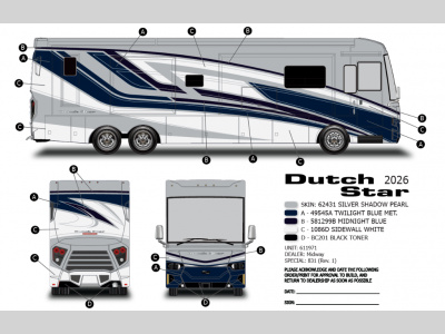 Luxury is waiting for you in this spacious Dutch Star Class A diesel motorhome that can comfortably sleep six each night. The full-wall slide plus two additional slides will open up the whole unit for a more at-home feel. Relax on the hide-a-bed sofa or read a book on the jackknife sofa. The hide-a-leaf dinette will be the perfect place to catch up on some work while you're away from home. Easily prepare breakfast, lunch, and dinner on the all-electric induction cooktop, or use the convenient stainless steel convection microwave with an air fryer feature. This model features a master suite with a pillowtop king bed, dual wardrobes and a dresser, plus an LED TV. You will love the rear bath cathedral ceiling that will add additional height, plus there is plenty of storage space and two bath sinks so that you and your spouse can freshen up at once! Specifications shown are with the standard Freightliner tag axle chassis. See dealer for details if optional Spartan K2 tag axle chassis is selected.