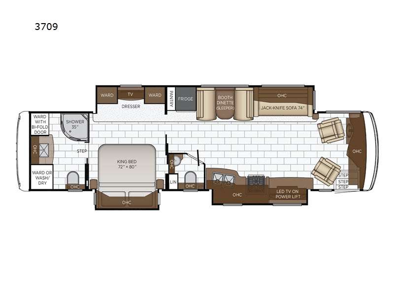 | TV Info | LR LED TV on Power Lift, BR LED TV | Awning Info | Power w/Alumaguard & LED Strip Lighting |