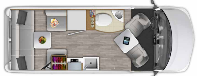 - Rear power sofa – forward facing - Forward facing 12 V rear power sofa with three seat belts. Easily converts to a queen size bed.